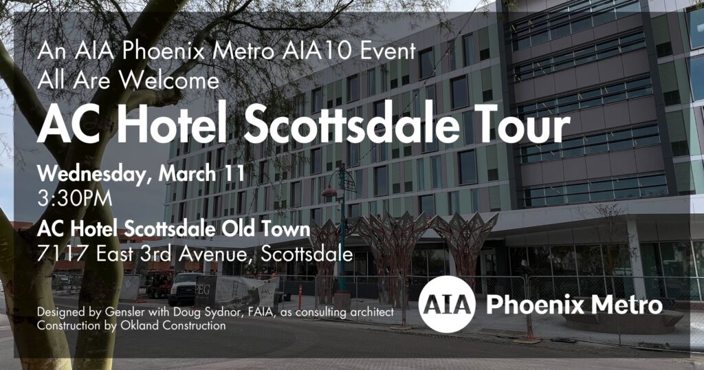 All are welcome to join AIA Phoenix Metro AIA10 for a tour of the AC Hotel in Old Town Scottsdale on Wednesday, March 11. The tour will be led by the design-build team which includes: Douglas Sydnor, FAIA, President at Douglas Sydnor Architect + Associates, Inc.; and Matt Halls, Project Manager at Okland Construction.