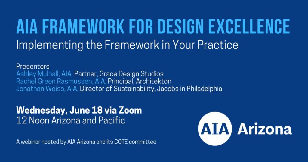 In this session—presented by AIA Arizona and its COTE Committee—architects with deep knowledge of the AIA Framework for Design Excellence will describe why the Framework is important and how firms at all scale can implement it with every client and every project, regardless of size and typology. For the 2025 AIA Arizona Design Awards, entrants in these three categories: Distinguished Architecture, Interior Architecture, and Unbuilt will be required to include project information for at least three of the 10 principles of the AIA Framework for Design Excellence.
