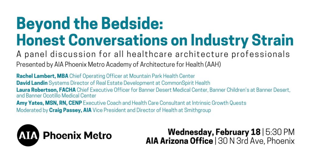 On Wednesday, February 18, the AIA Phoenix Metro Academy of Architecture for Health (AAH) will host a panel discussion with local health industry leaders as they share their perspectives on what is keeping them up at night, and how they are navigating the uncertainties and pressures they are facing. The conversation will be focused on healthcare, but architecture professional working on other project types will find the discourse to be valuable.