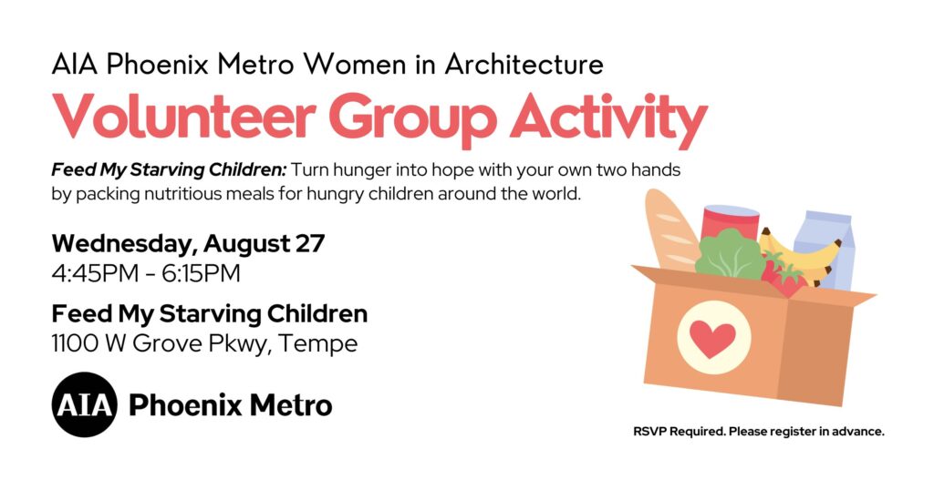 Looking for an incredible opportunity to volunteer and give back to the community? Turn hunger into hope with your own two hands by packing nutritious meals for hungry children around the world. Join AIA Phoenix Metro Women in Architecture on Wednesday, August 27 at 4:45pm, for an evening of connection and volunteering at Feed My Starving Children in Tempe.