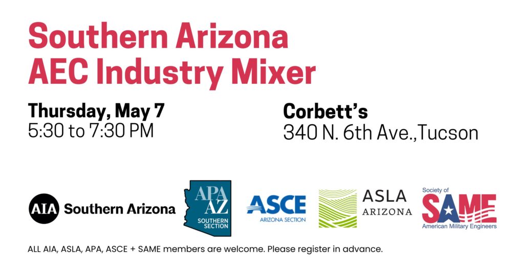 Are you an architect, engineer, contractor, or part of the AEC industry in Tucson? All are welcome to join us on May 7 at Corbett’s in Tucson for an AEC networking event!
