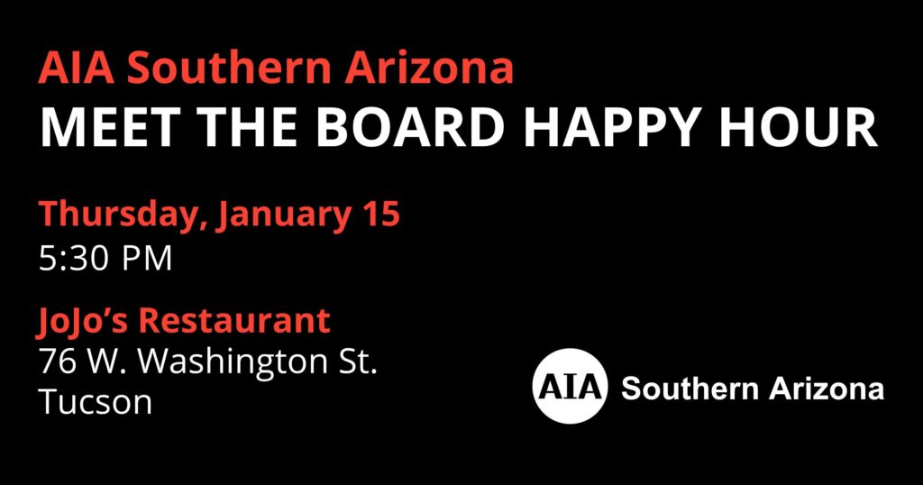 Join us on Thursday, January 15 at JoJo’s Restaurant in Tucson for a fun happy hour event to meet your chapter leadership and network with fellow members as we look ahead to 2026! This is a great opportunity to share ideas, spark new conversations, and help shape what you’d love to see AIA Southern Arizona take on in the coming year.