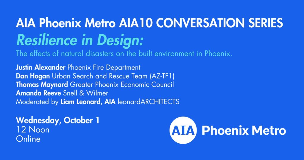 Moderated by Liam Leonard, AIA, of leonardArchitects, the panel will include Justin Alexander, Assistant Chief, Community Risk Reduction at Phoenix Fire Department; Dan Hogan, Structure Specialist for FEMA/DHA Urban Search & Rescue – Arizona Task Force 1; Thomas Maynard, Senior Vice President at Greater Phoenix Economic Council, and Amanda Reeve, Environmental and Regulatory Policy Advisor at Snell & Wilmer.