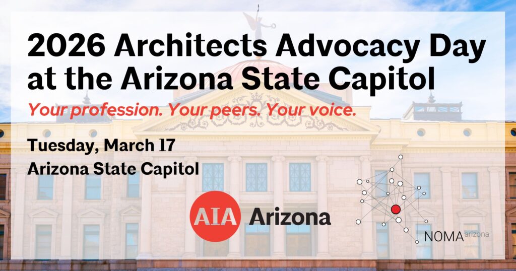 All are welcome to join AIA Arizona, in collaboration with NOMA Arizona, for Arizona Architects Advocacy day on Tuesday, March 17, at the Arizona State Capitol. When architects engage in advocacy, we help shape the policies that impact our practice. Your presence reinforces the value of architecture in legislative decisions made about the built environment.