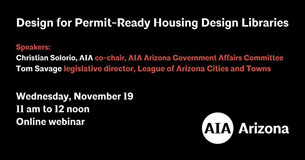 Join AIA Arizona and the League of Arizona Cities and Towns for an informational webinar on a new Request for Information (RFI) seeking architect participation in developing permit-ready housing design libraries under Senate Bill 1529. These programs will help Arizona cities and towns accelerate housing construction by offering pre-approved design plans for single-family homes, ADUs, and small multifamily units.