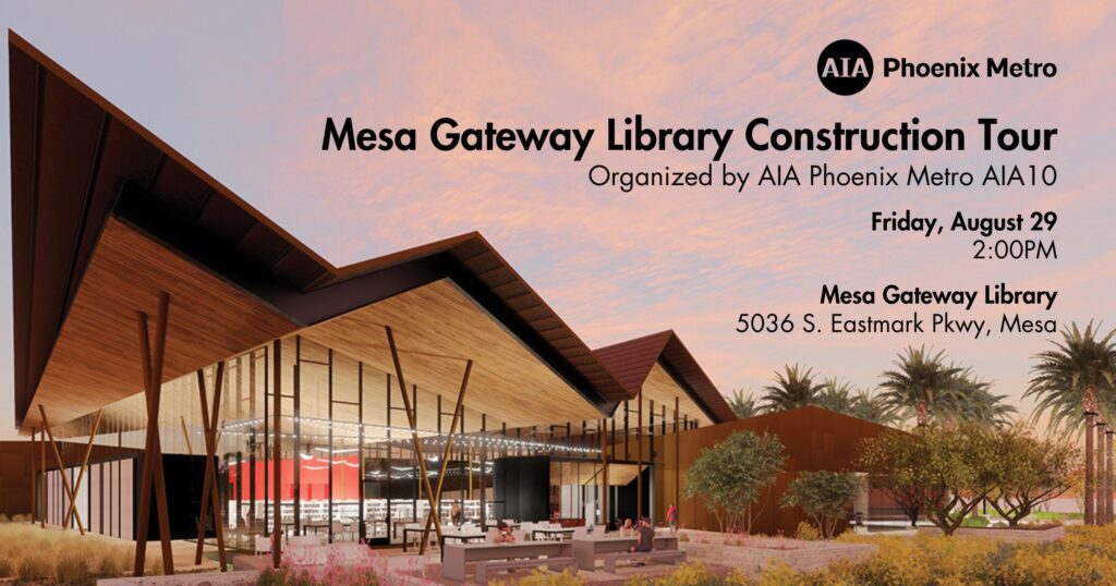 Join AIA Phoenix Metro AIA10 and RICHÄRD | KENNEDY Architects for a construction tour of the Mesa Gateway Library in Mesa, a design that reflects the City of Mesa’s vision for their facilities and library system: “curiosity, learning, connection, inspiration, creativity, and dreaming starts here”. This building was designed by RICHÄRD | KENNEDY Architects and the general contractor is Willmeng.