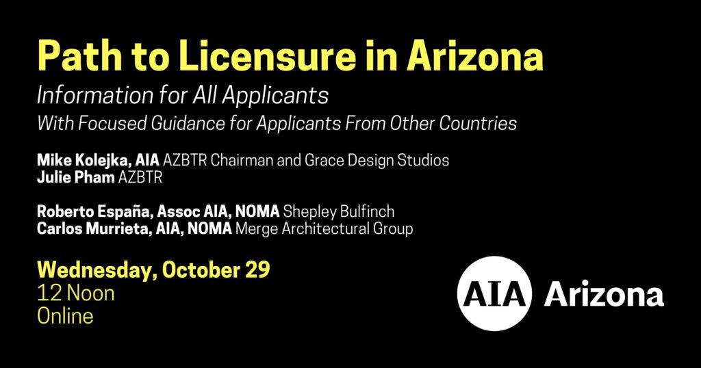 This informative webinar will outline the steps to becoming a licensed architect in Arizona. The chairman and staff from the Arizona Board of Technical Registration (AZBTR) and select AIA members will offer need-to-know valuable information and personal insights as well. With essential guidance for all applicants, the webinar will include a focused portion of information for those educated and/or trained outside of the United States.